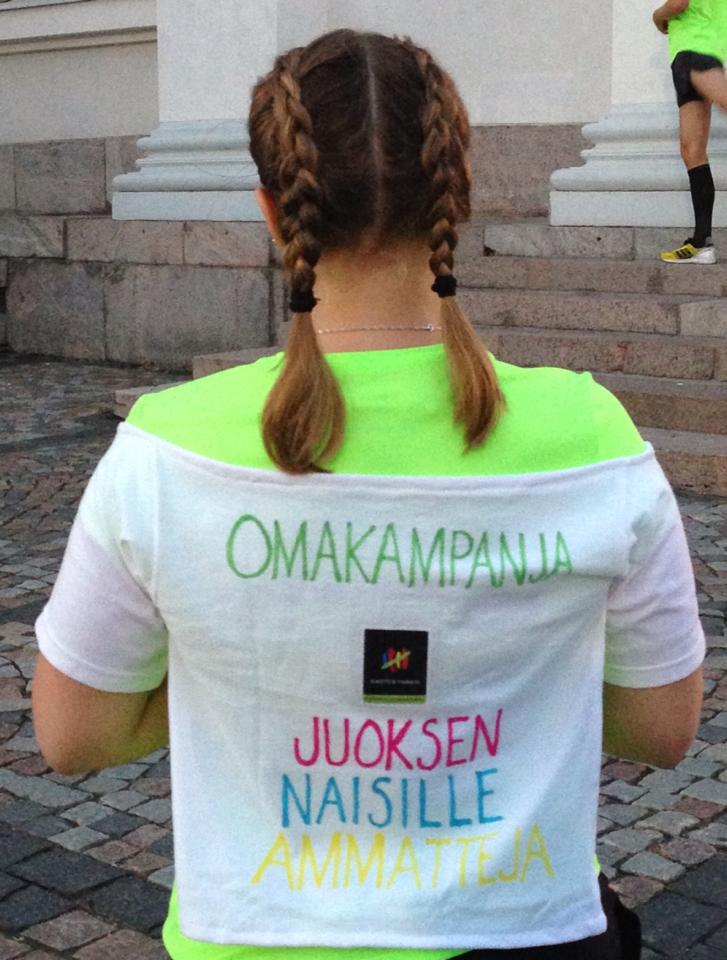 Itsessään massajuoksutapahtumassa on aina oma mukava tunnelmansa, mutta tällä kerralla sitä lisäksi kohotti juoksuni erityisluonne – en juossut vain omaksi ilokseni, vaan juoksin monen kehitysmaan naisen tueksi. Juoksuani siivitti ajatuksissani myös hankettani kannattaneiden kannustukset – ja heidän uskonsa kampanjan mahdollisuuksiin vaikuttaa monen vähempiosaisen arkeen. Olin askarrellut virallisen juoksupaidan päälle selkääni laitettavan omakampanjamainoksen, jota kyllä ihan ylpeästi esittelin juoksun aikana Helsingin yössä teiden varsien kaupunkilaisyleisölle. Ehkä jollekulle jäi mieleen sana omakampanja!