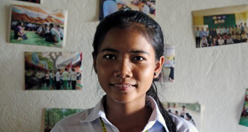 Nuori nepalilainen opiskelijatyttö Srey Ny katsoo kameraan huoneessaan.