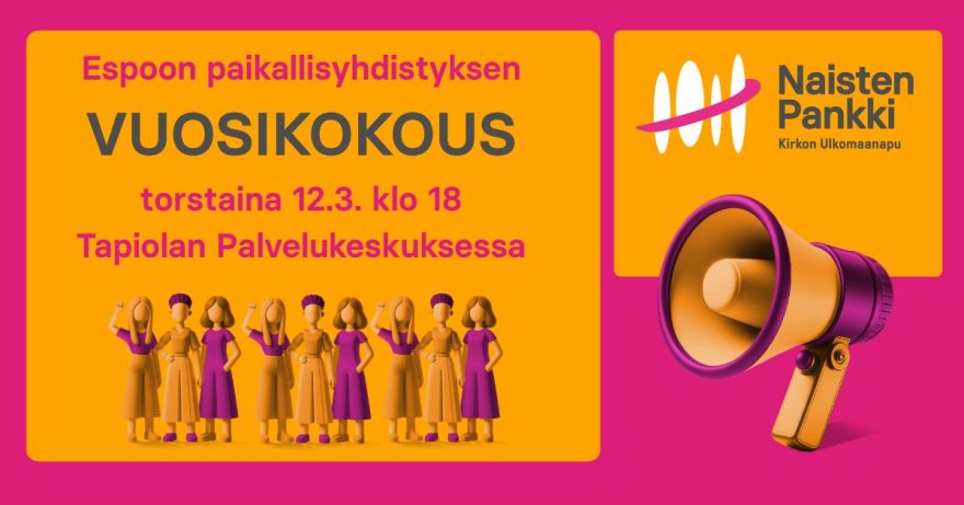 Paikallisyhdistyksen sääntömääräinen vuosikokous järjestetään torstaina 12.3.2026 klo 18 Tapiolan Palvelukeskuksessa.