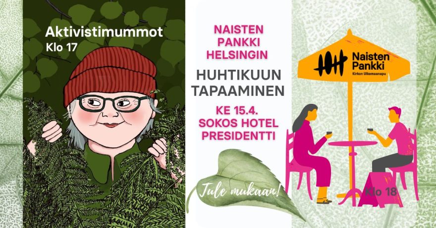 Keitä ovat Aktivistimummot? Se selviää keskiviikkona 15.4. kello 17 hotelli Presidentissä. Kello 18 jatkamme iltaa Naisten Pankki Helsingin kuukausitapaamisella. Tule paikalle!
