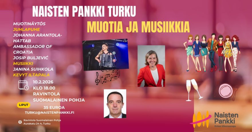 Tervetuloa nauttimaan helmikuisesta illasta Janina Suihkolan kiehtovan musiikin, ohjaustiimin puheenjohtajan Johanna Arantola-Hattabin sekä Kroatian Suomen suurlähettilään Josip Buljevićin puheenvuorojen sekä vapaaehtoistemme järjestämän upean muotinäytöksen avulla.
