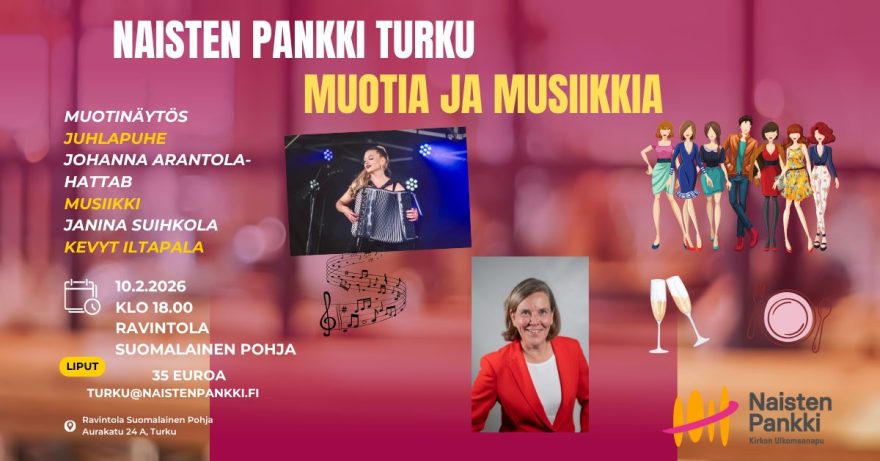 Liput 35 euroa/henkilö sisältäen ohjelman ja iltapalan. Kaikki illan tuotto (noin 50%) ohjataan Naisten Pankin hyväksi. Varaa lippusi turku@naistenpankki.fi – vastauspostissa maksuohjeet.