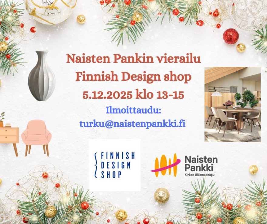 Tervetuloa mukaan Naisten Pankin vierailulle Finnish Design Shopiin 5.12.2025 klo 13-15. Vierailu on toteutetaan pienenä vapaamuotoisena tilakierroksena, jonka aikana meille kerrotaan Finnish Design shop yrityksestä, heidän toiminnastaan ja Aviatien tiloistaan. Loistava tapa viettää yhdessä vapaaehtoisten päivää!