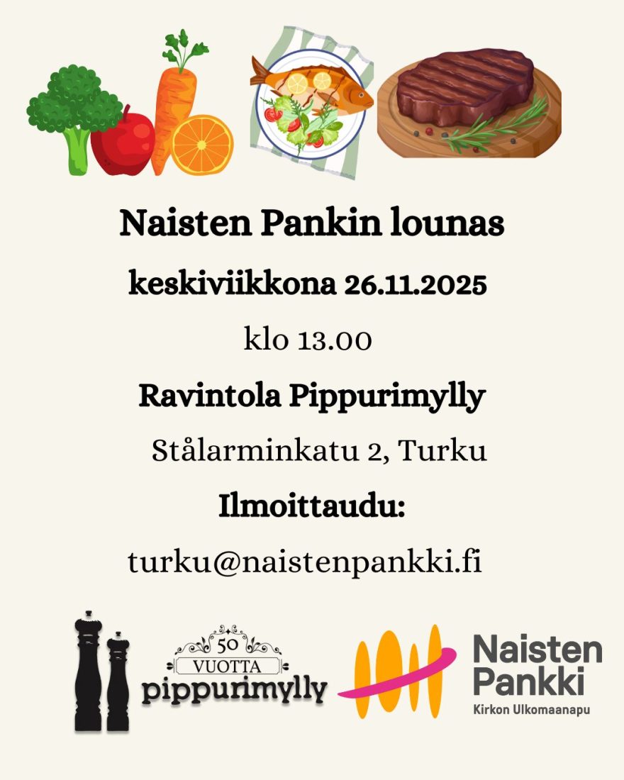 Tervetuloa Varsinais-Suomen/Turun Naisten Pankin lounaalle 26.11.2025 klo 13 Ravintola Pippurimyllyyn, Stålarminkatu 2, 20810 Turku.