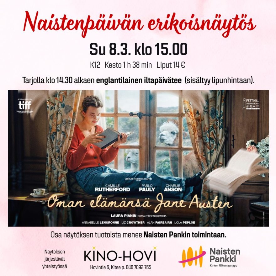 Naistenpäivänä Kino-Hovi ja Naisten Pankki Kitee järjestävät elokuvaesityksen Oman elämänsä Jane Austen. Ennen elokuvaa kello 14.30 alkaen Naisten pankkilaiset tarjoavat teekupposen ja pikkupurtavaa englantilaiseen tyyliin. Esityksen hinta 14 €, josta osa ohjataan Naisten Pankin toimintaan, tarjoilu sisältyy lipun hintaan.