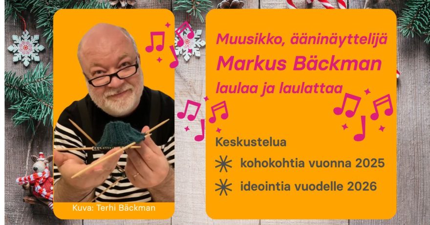 Ylpeänä esittelemme vieraamme, joka on muusikko, ääninäyttelijä Markus Bäckman. Hän laulaa suosikkikappaleitaan. Nautimme musiikista myös niin, että Markuksen johdolla jokainen voi osallistua yhteislauluun! Laulujen sanojen muistamisesta ei tarvitse huolestua, sillä ne ovat jaossa paikan päällä. Pääasia on iloinen yhdessäolo!