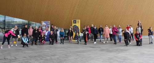 Joukko naisia seisomassa puuverhoillun rakennuksen edessä.